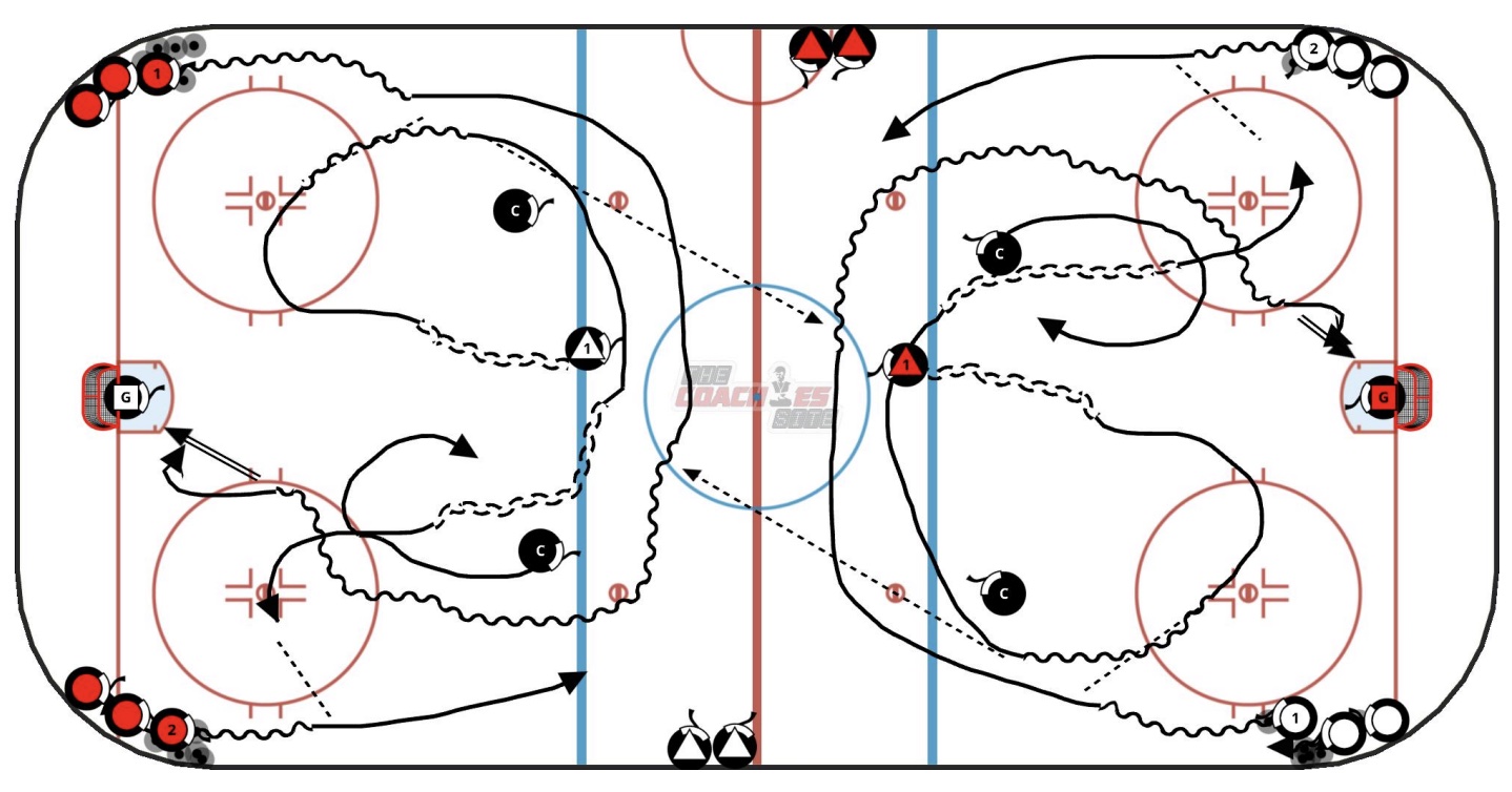 On whistle, F1 skates with puck and drops it near the top of the circle, then cuts across the blue line for a stretch pass from opposite D1. At the same time, D1 back skates, pivots and picks up the puck before making a stretch pass to F1 from other side. F1 attacks net under pressure from Coach then stops at the net in a rebounding position. D1 now regroups out over the blue line, pivots backwards to pick up next puck dropped near other circle by F2. D1 now looks for opposite F2 cutting at high blue line. F2 times their start with D1 crossing the blue line. F2 now cuts across the blue line for stretch pass before splitting the two coaches near the blue line.