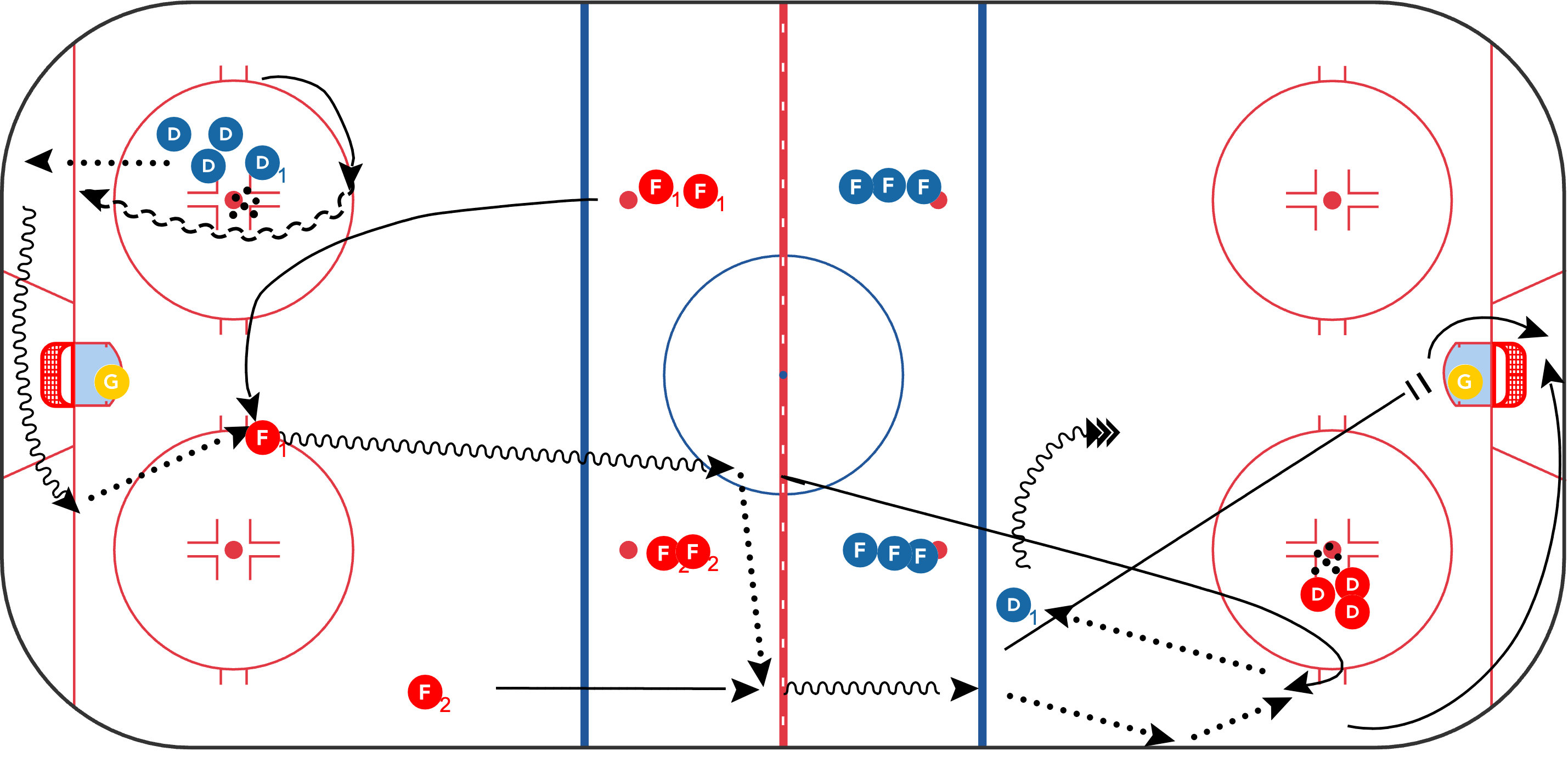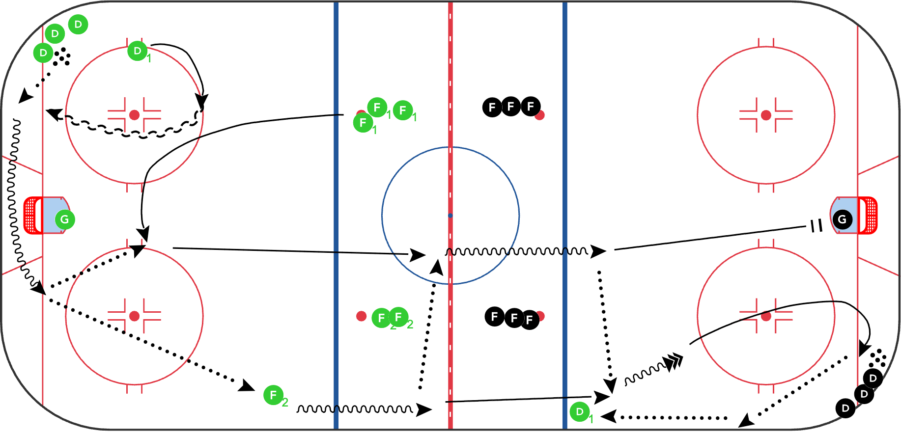 Same start, but now the forward who enters the offensive zone is pulling up to hit the trailing D with a perfect pass, one-timer to follow, seeing-eye tip in front and the goalies are mad already. Beautiful!