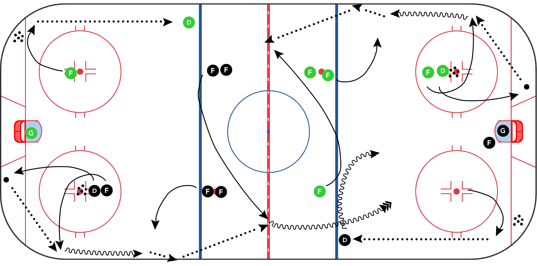 This looks crazy but it's really not, I promise. On the first breakout pass, the D passes up the strong side to the forward from the previous rep. they move it up the wall and then we get a slash support breakout from the weak side.
