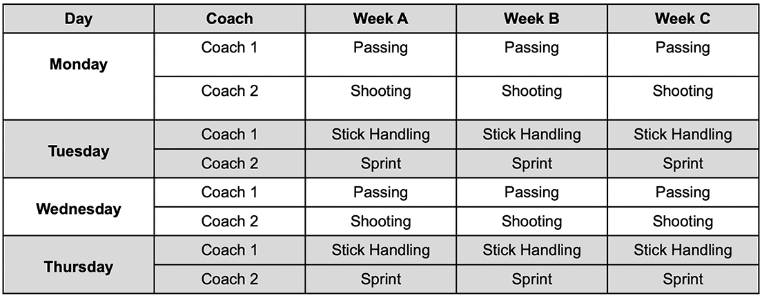 Table 4. Rotate through passing, shooting, stick handling, or sprint station every day.