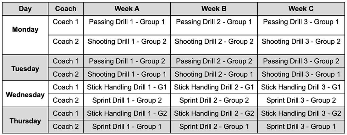 Table 5. Perhaps the most efficient for Coaches, split the team in two and keep them at one station for 15 minutes. With this method, coaches may repeat what they did for a station at 2 practices. Observe Monday and Tuesday, Week A. Coach 1 uses the same passing drill for Group 1 on Monday and Group 2 on Tuesday, which means less planning needed for the Coach. Players have a 15 minute time period to develop and enhance said skill.