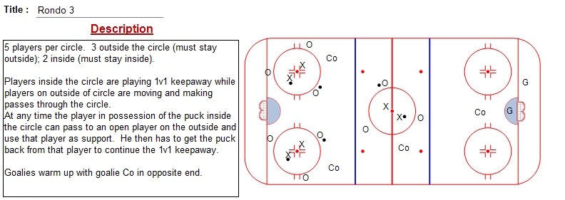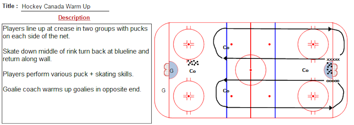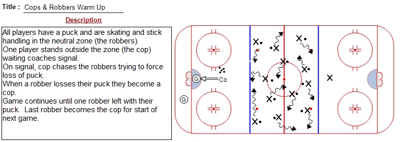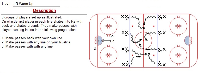2.     Create a set of opening activities (6-8) and name them. Provide them to your players so they learn them and know them by name. At practice all you do at the pre-ice is tell them the name of the warmup you will be doing. You can cycle through the warmups so none become boring or stale.