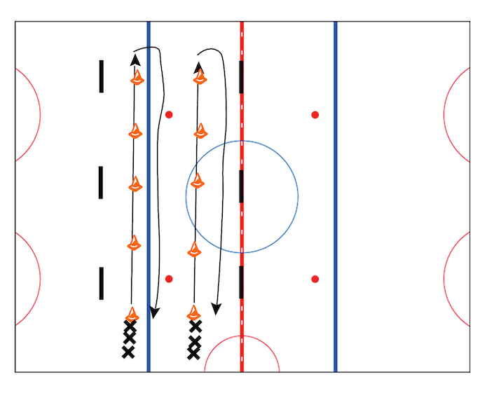 Coach draws lines on the ice to designate starting point for the players and places a cone at the far side of the ice inline with the player line.