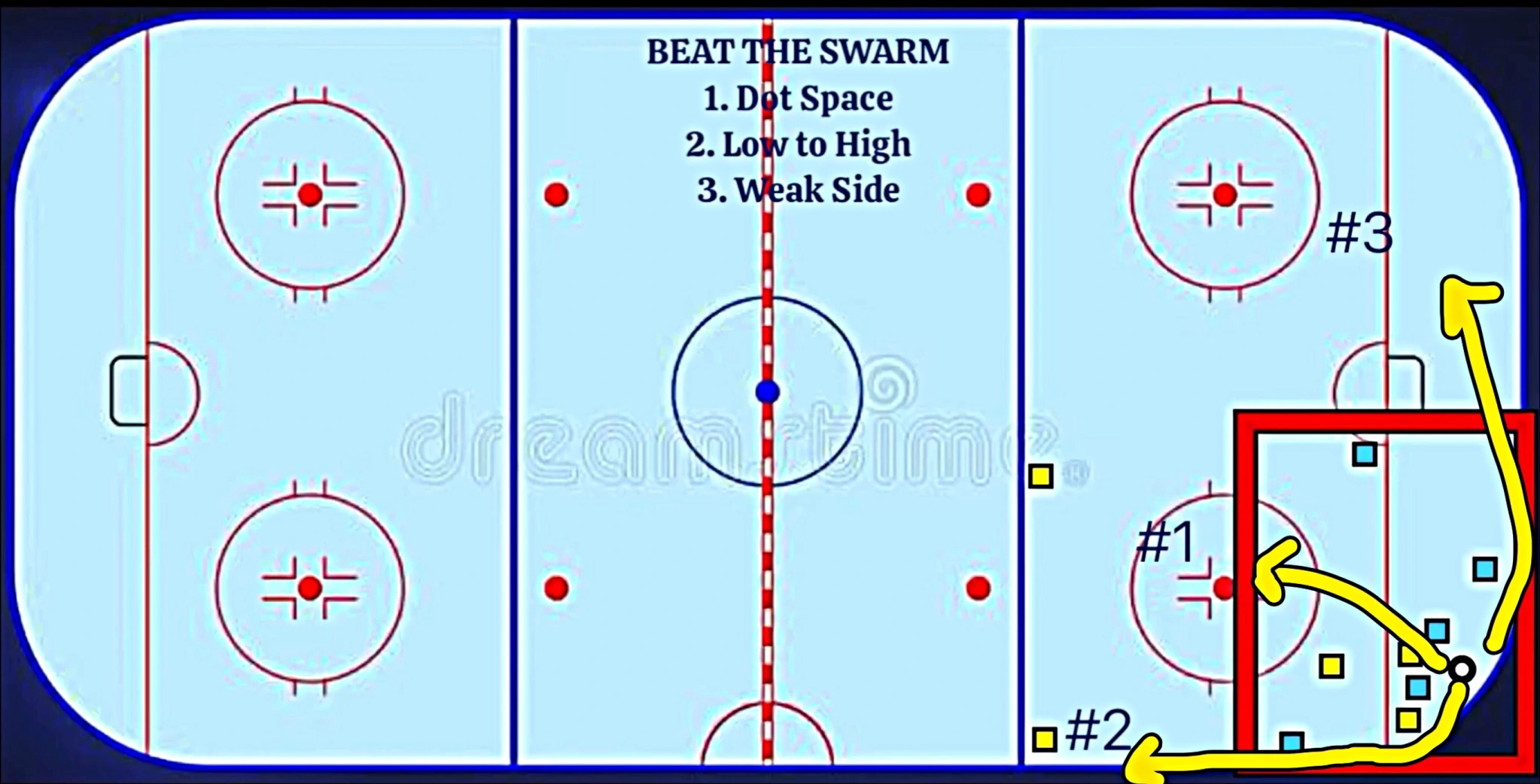 How a defensive group pressures up on a corner puck is a good scenario to describe the swarming or outnumbering/overloading defensive tactical play. How defenders pressure up in their defensive zone on a low corner puck or puck below the goal line; whether it’s a D and F or two D with a low F covering the net zone or even two D with a low F with two other low F’s positioned strong side low below the hash marks in coverage. There will be variations on how the group decides to pressure up based on the situation. Every defender must know their role and how to execute that role.