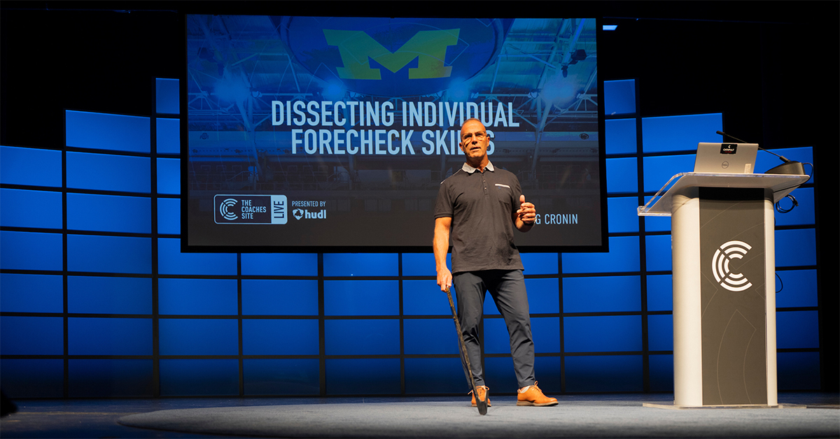 Defenceman going back to get a puck on a breakout is no different than what happens on a surfboard. This is Greg Cronin’s approach to explaining the individual skills involved in forechecking. Cronin walked coaches through the 5 steps of skill development, beginning with ensuring the player is aware they aren’t executing an event successfully, to manipulating other players in game play. He emphasized the steps of a forecheck: stick on the ice, belt buckle to belt buckle on approach, pick the pass off, and create a chance. Cronin highlighted the importance of awareness of pressure, saying “somebody’s hunting, and someone's being hunted.”