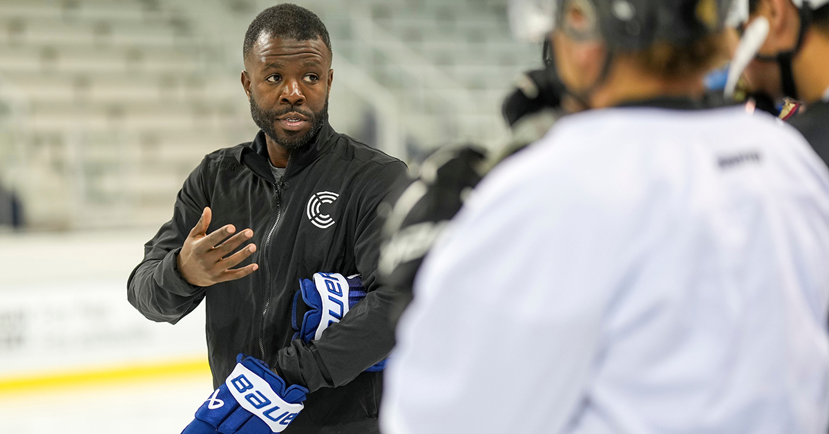 The day kicked off with Duante Abercrombie’s strategy for creating offence from the wall. Abercrombie knows that all coaches want to lead teams that play fast. He began with a simple drill, having players grab a loose puck along the wall at low speed and as soon as they touched it, turn quickly and accelerate through. He noted that players are always going to be under pressure and defenders are working to react to their direction and speed, so he added a player diving into the drill and forced the player to protect the puck. Abercrombie translated this technique to 2-on-2 situations and emphasized the importance of being aware of their surroundings and always moving to the middle of the ice from the wall.