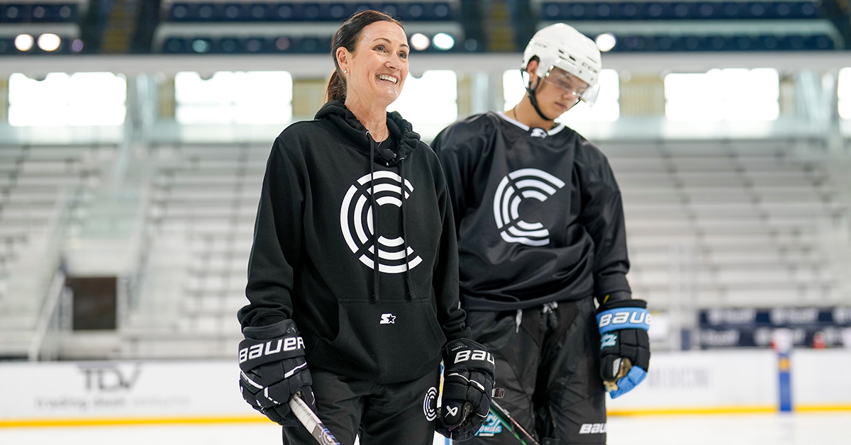 Jill Plandowksi hit the ice next to break down the mechanics and strategy behind a fluent backward skate. She started with working on the foundations, which begins with posture. With hips and shoulders aligned and full blade on the ice, it allows for easier control into the glide. With the players on ice, Plandowkski went through a series of drills progressing from two foot glide, to a one foot, to then being able to add the push. During this step specifically, she encouraged the crowd when teaching younger players this move to make a question mark with their skate for power rather than a traditional C. Plandowski emphasized that being able to shift weight between legs is the key to an effortless backward skate. When putting everything together at full speed, Plandowski’s backward skate is built on posture, glide, and weight shift.