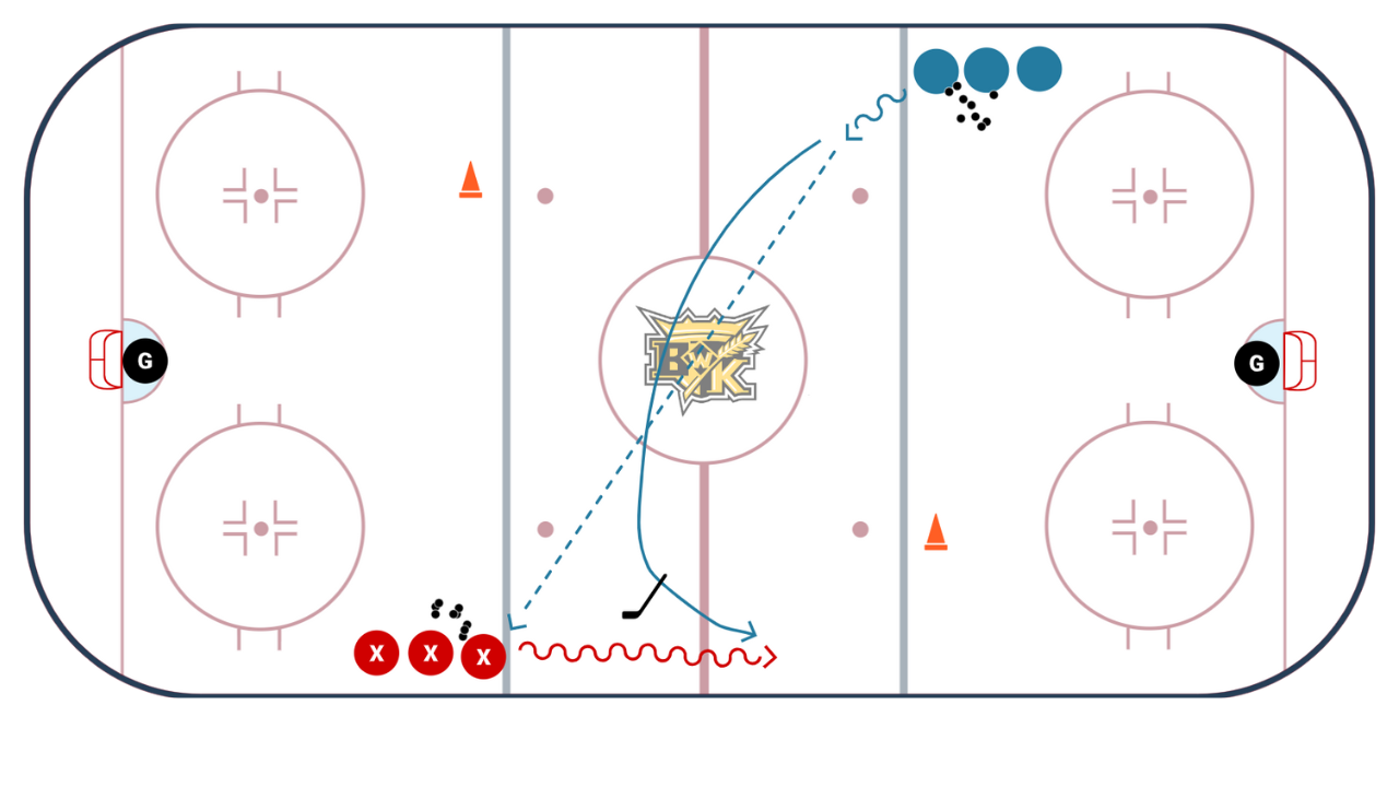 Incorporating off-puck skills into practice requires thoughtful skill-stacking planning and execution by coaches. Focused drills how to support teammates when you don't have the puck, can significantly enhance a player's overall game awareness and hockey IQ. Using small area games with boundaires is a great way to work on these skills. In the picture below, I created a traingular read SAG using boundaires to help players understand how to support each other in the Ozone. click on this link to see my post on Teaching Triangular Reads Through Small Area Games.
