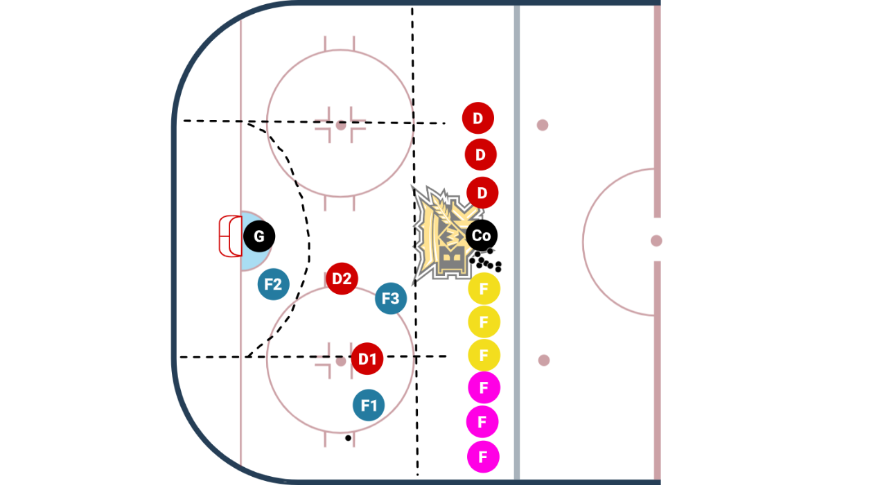 - The coach will spot F1 the puck, and as soon as F1 recieves the pass from the coach, D1 is now activated to attack