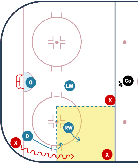 - The winger (shown as RW in the diagram) works to not let the puck carrier skate the puck through the quadrant and to kill the play before they are able to attack the net.