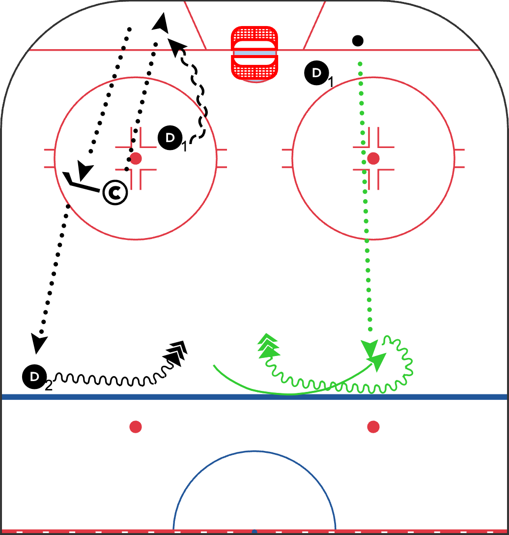 - D1 retrieves puck off the spray or rebound while D2 gets lost in the high ice