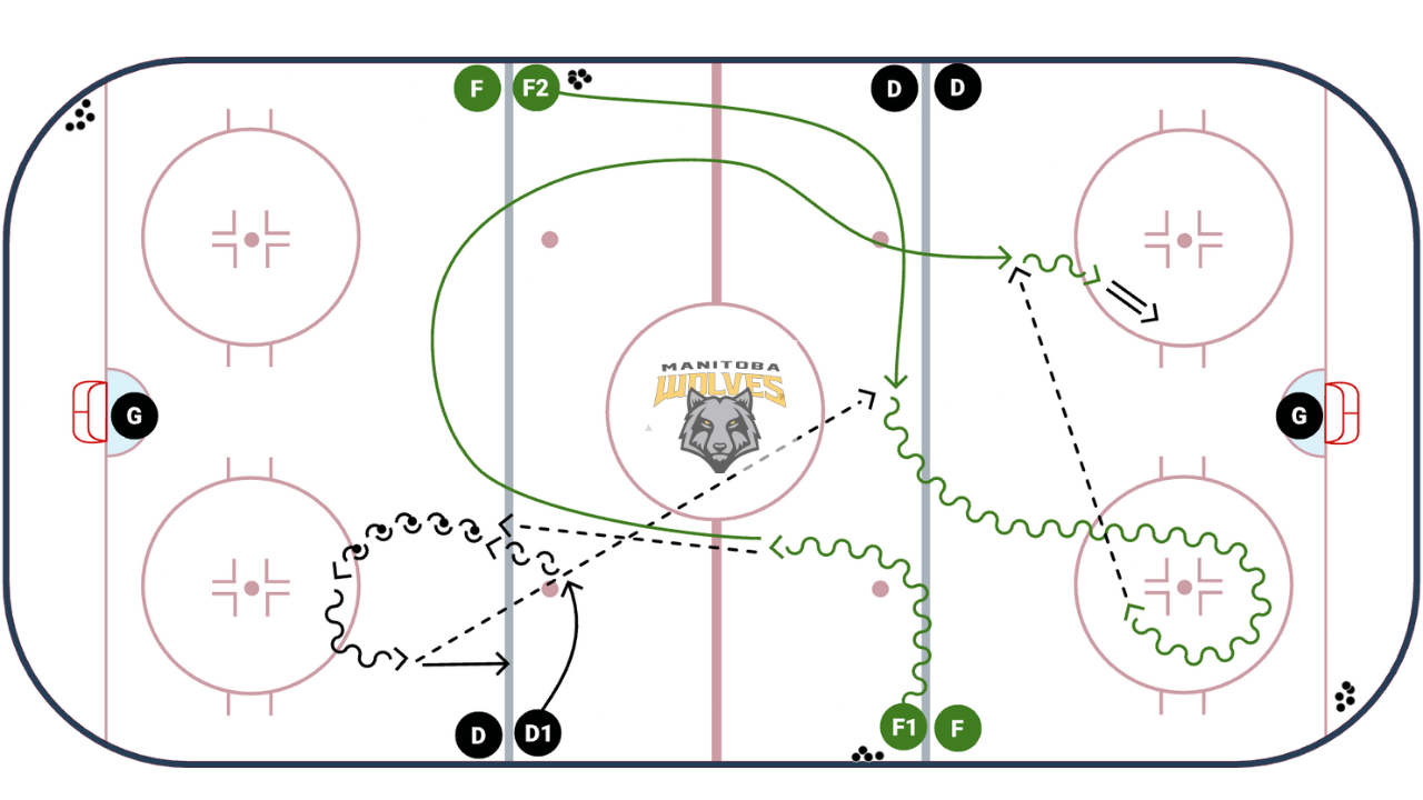 - While this is going on, F2 keeps their head up and times their route to go up the boards and to be full speed in the middle of the ice while D1 is finishing their escape.