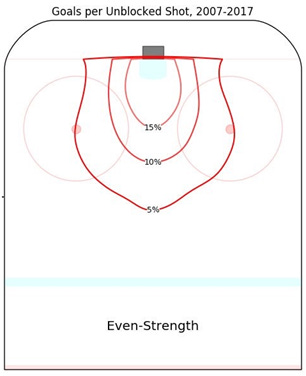 The first reason why point shots suck is that they don’t result in goals very often. From 2007-2017 Micah Blake McCurdy found that the shooting percentage from outside the house has been under 5%. His website HockeyViz has great content beyond just this. He is a former math professor who decided to work on hockey analytics in the public sphere (he has turned down multiple NHL teams).