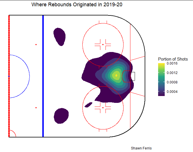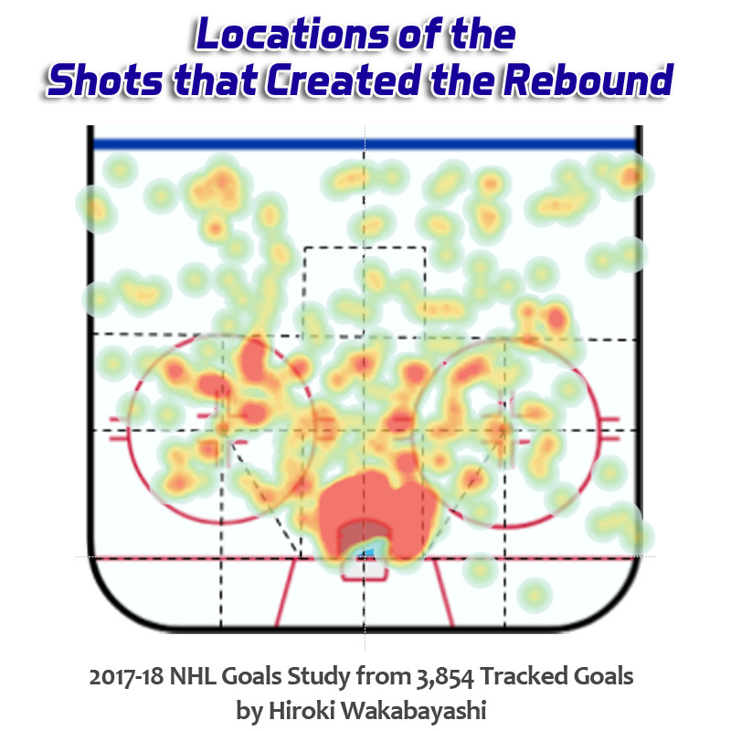 During the 2017-18 NHL season, Hiroki’s Analytics did a bunch of studies on goal scoring. One of their focus areas was rebounds. Not surprisingly and backing up what we just learned, point shots don’t often create rebounds. Shots from the house create rebounds with more frequency.