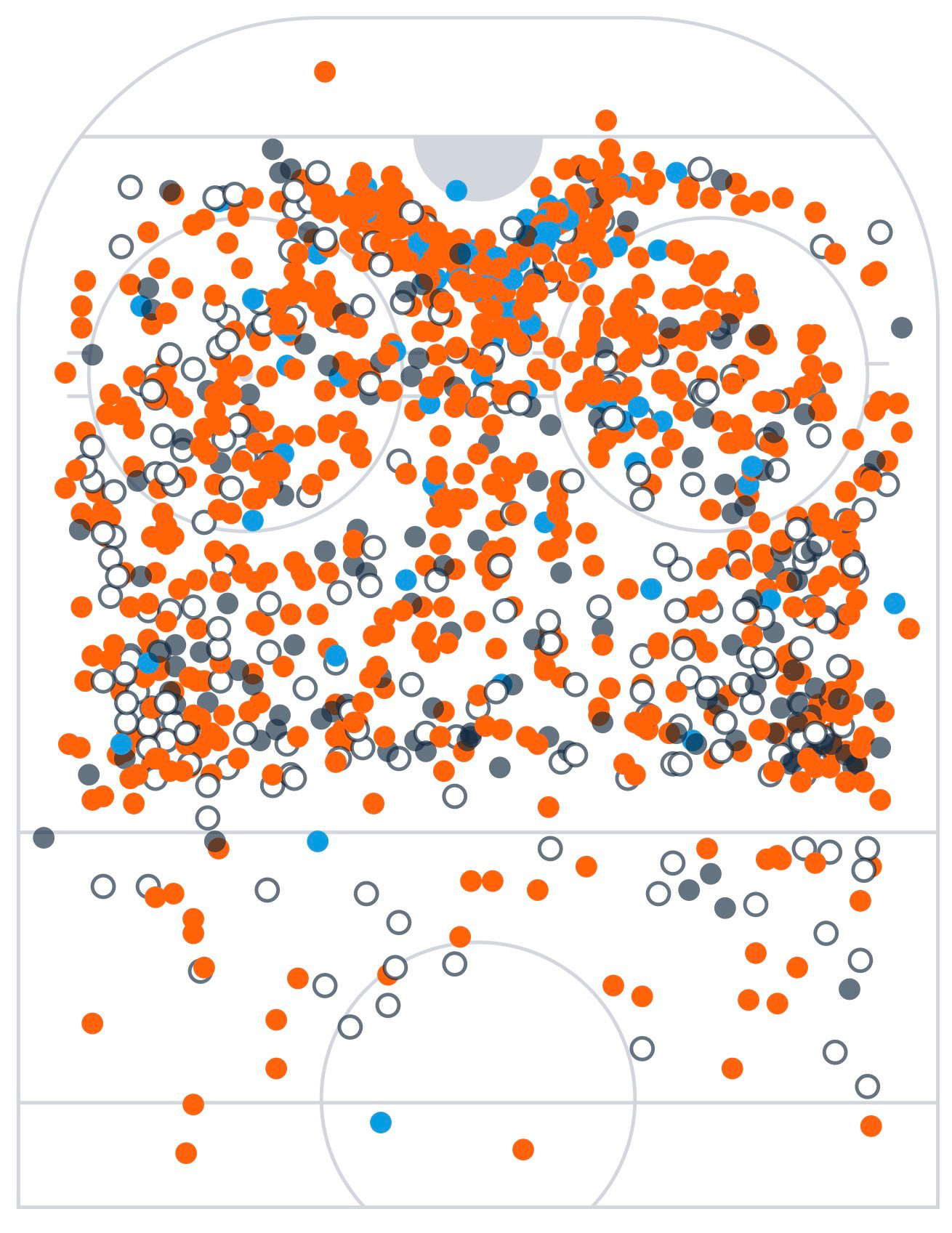 Goals – And finally…the goals. Funny how all the clusters at the points went away. All the goals are at the net. As a Russian coach once told me, “Go to net, score goal.”