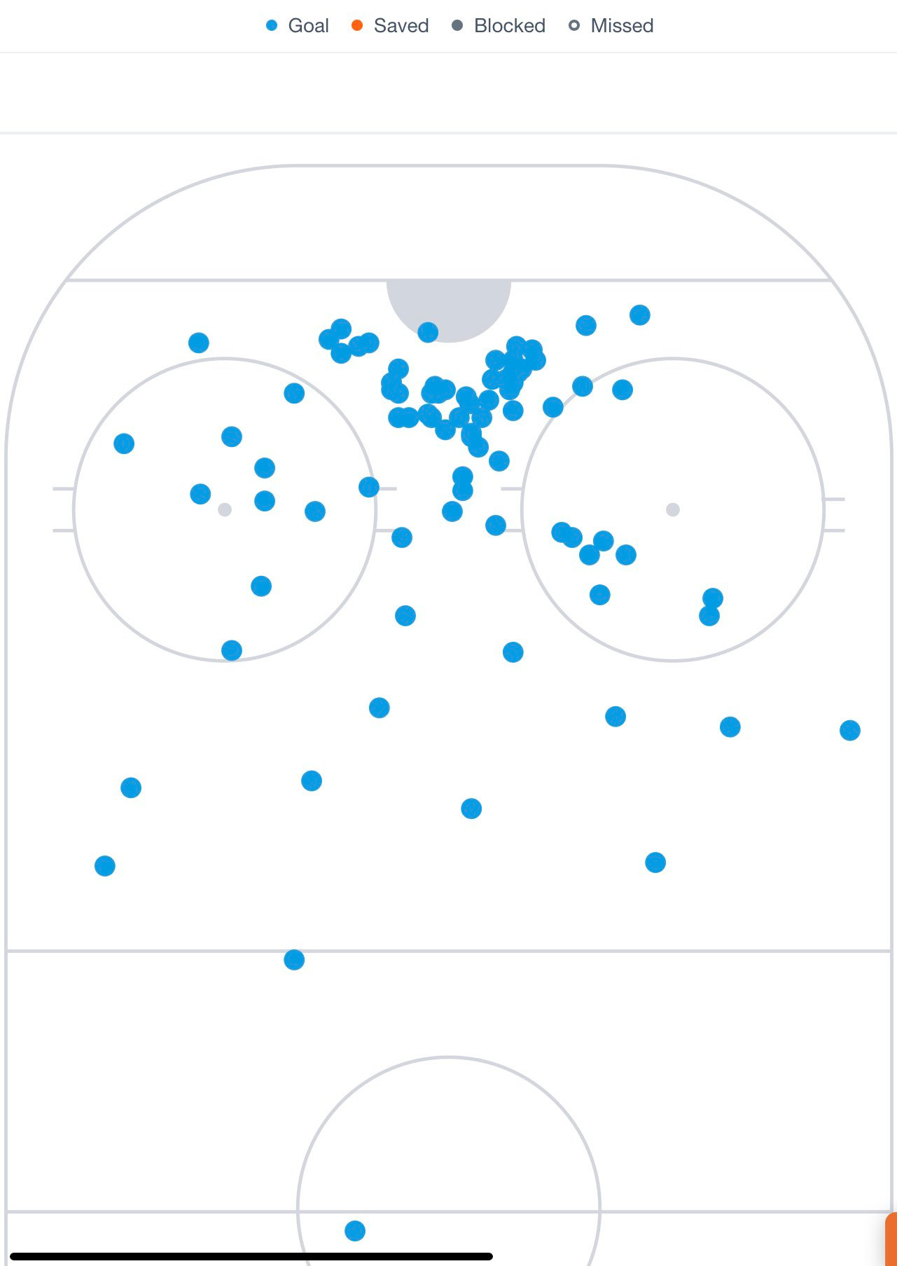 Combining that with other data such as Clear Sight Analytics has come to show that point shots with traffic score around 3% of the time and without traffic score about 1% of the time. That is basically “playing catch” with the goalie.