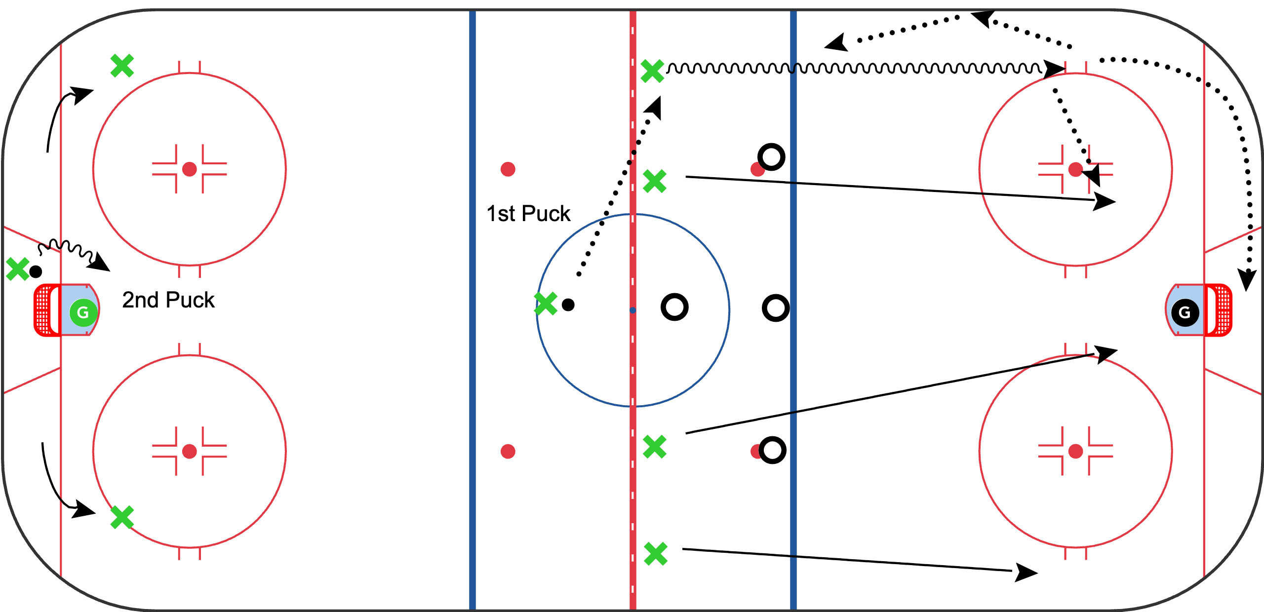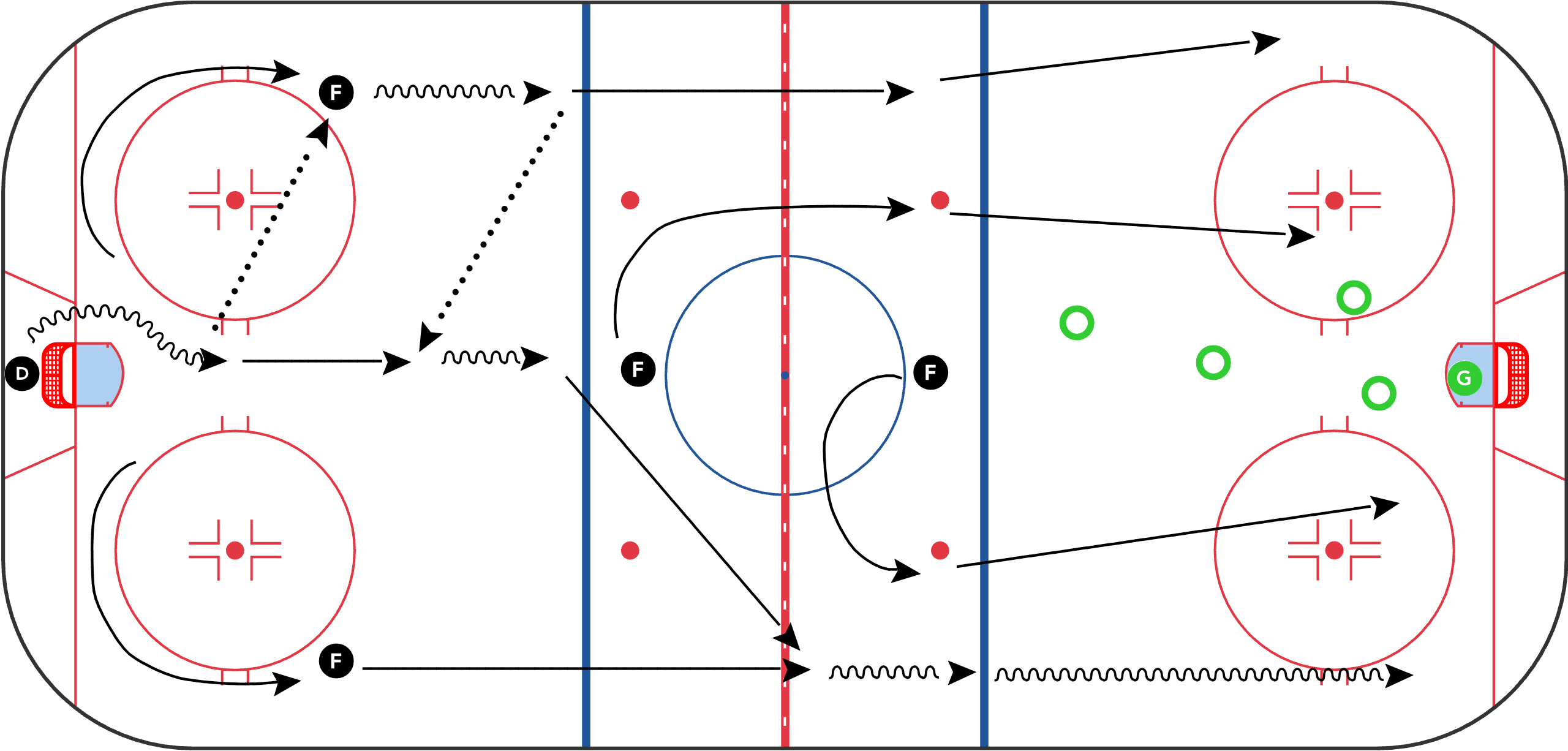This breakout works best if the two swinging players are on their forehand sides, which means they're on their downhill / forehand sides in the in-zone setup. Middle forwards always stay in the middle of the ice, drive the middle and finish routes at net.