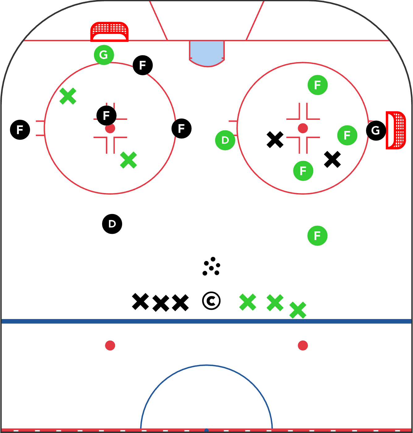 Alright, back where we started in this post, but not where we start on the ice: in the zone. There are a lot of components, but ultimately the point of a power play is to score, and that usually doesn't happen off the rush (although we should try to make that happen more). I encourage you to run your power play's in-zone setup with the whole zone, but here's a game that will get everyone involved and, like my old coach in junior Dave Goretzki used to say with his unique central Albertan drawl, "just play hockey!"