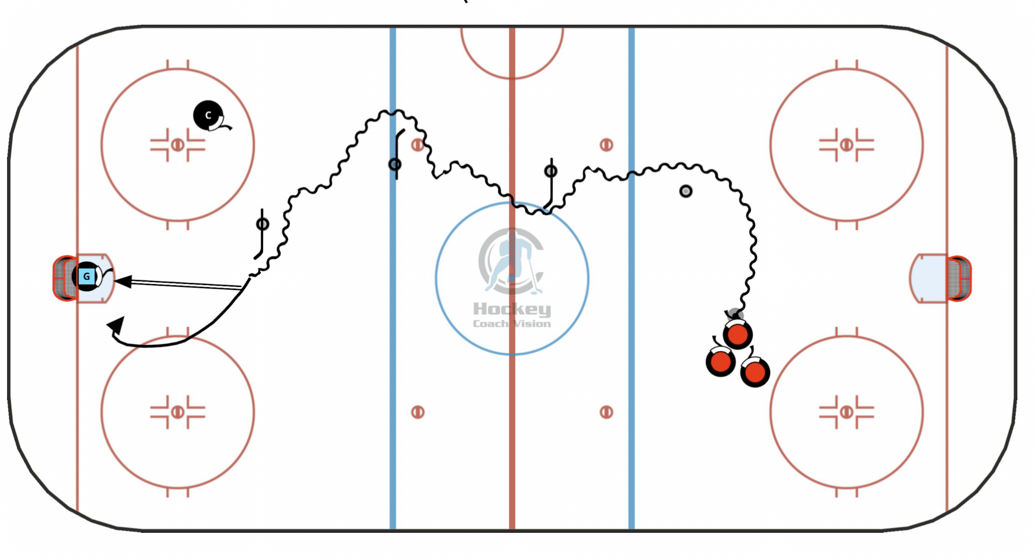 hen makes three quick gliding turns through the obstacles finishing with a shot on net. Player should work on smooth weight transfer from skate to skate to initiate each gliding turn maintaining the glide.