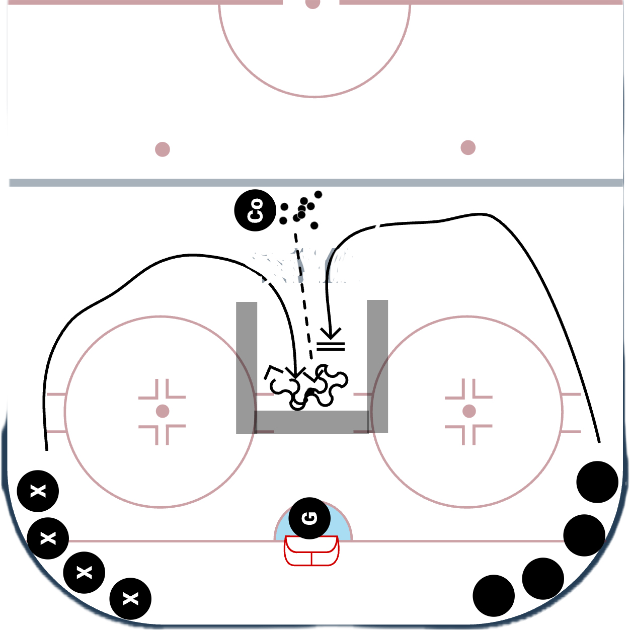 This simple, open ended drill simulates a small area battle and creates conditions useful to teach individual offensive loose puck retrieval and protection tactics, and simultaneously individual defensive tactics. It is recommended that the coach identify a tactical emphasis and reinforce their players' ideal skill choices, execution and success.
