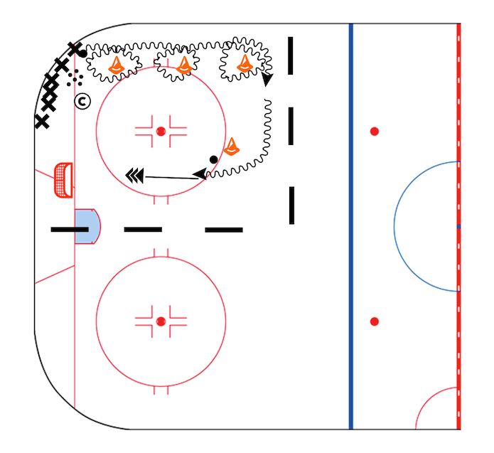 Coach places 3 cones in front of the line and a 4th cone near the middle of the ice.
