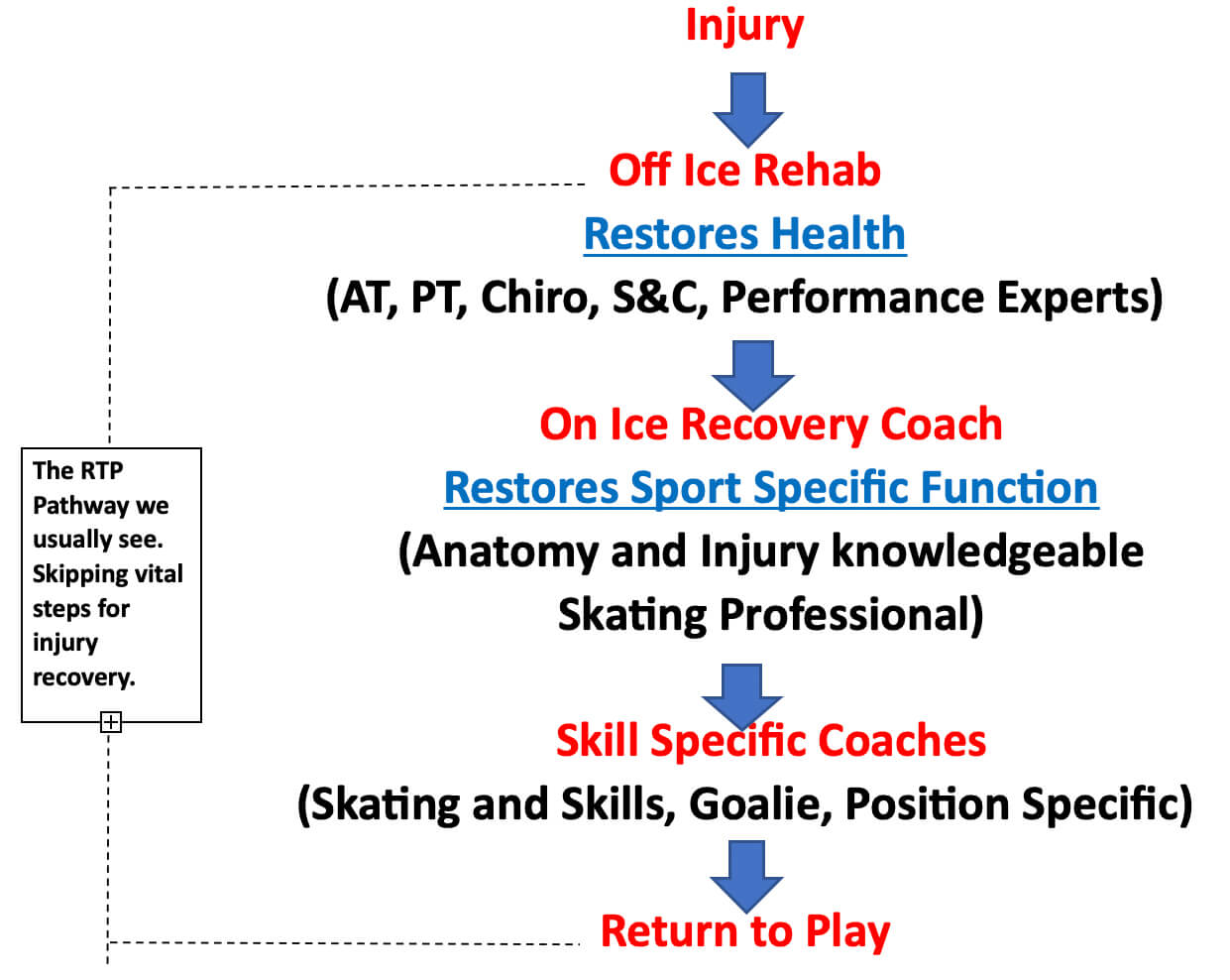 The diagram below is what I think the process should look like. Once off ice rehab (health) has been completed, then the On Ice Recovery Coach (function) is engaged. As the player improves and risks are removed, the Skills Coaches are engaged, and the player is progressed to competitive pace skills and drills in preparation for RTP. Again, that’s what I think it should look like. No one loses a job. No one is excluded. A dedicated team approach with each layer performing in their area of expertise and then trusting the next layer to continue the process all to the benefit of the player, team and organization. Unfortunately, the path with the dotted lines is usually the route taken to return players.