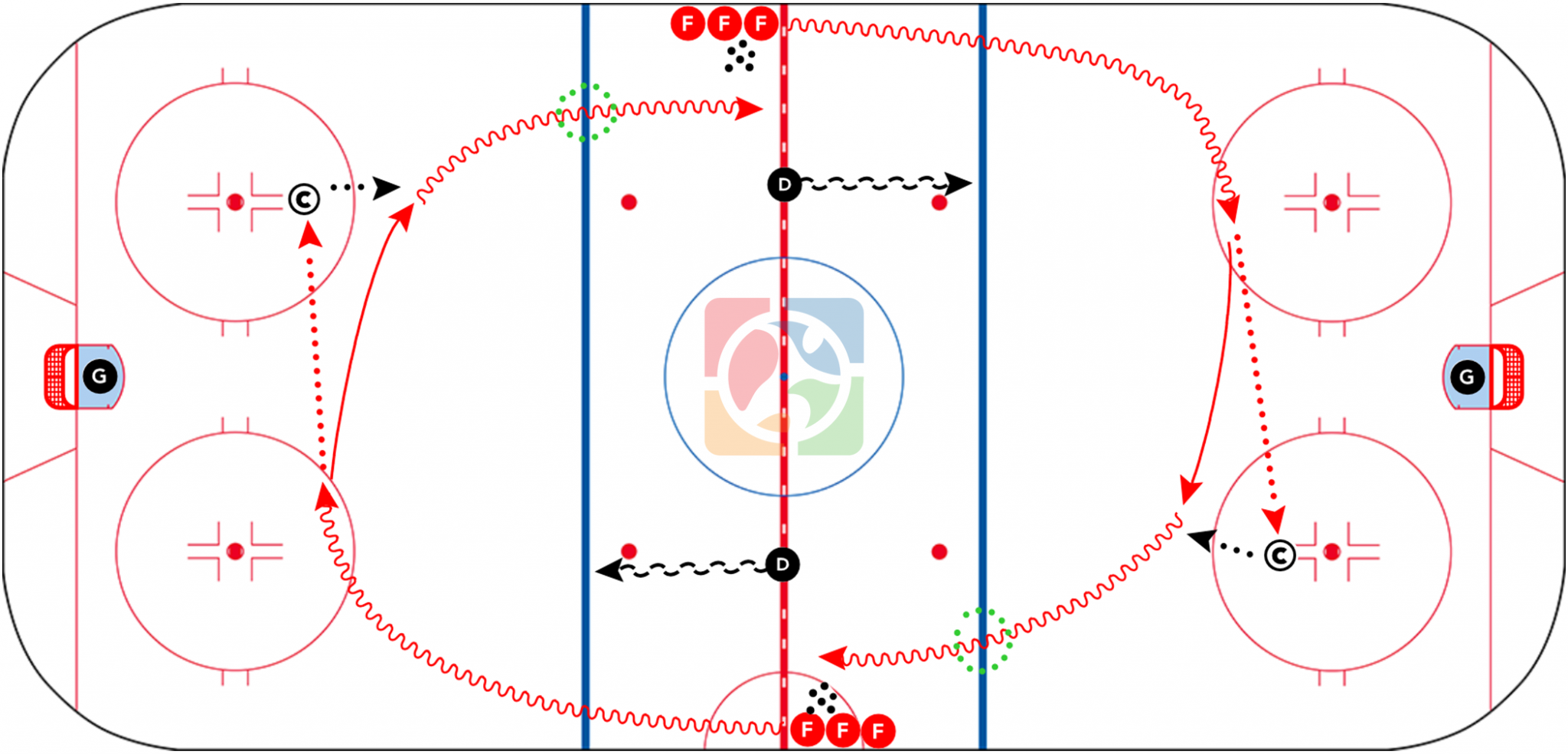 • Fs start at the same time with pucks while D is stationary on the red line facing up ice.