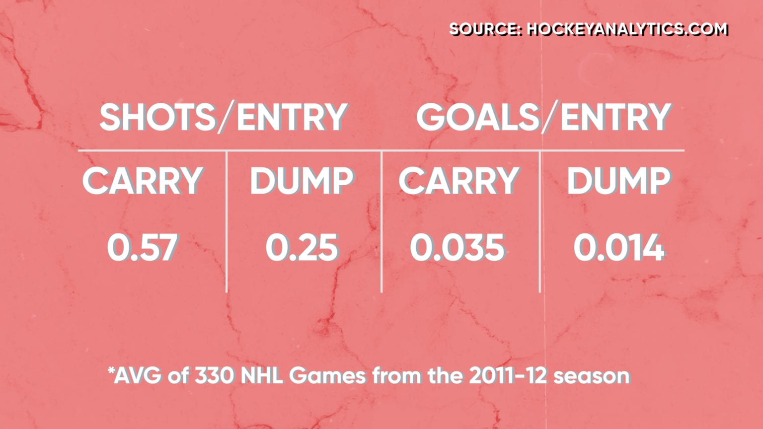 Their data collection method was simple. Through 330 tracked NHL games, they measured the two methods of entry and their impact on two offensive categories: the shots and the goals that were generated from each entry.