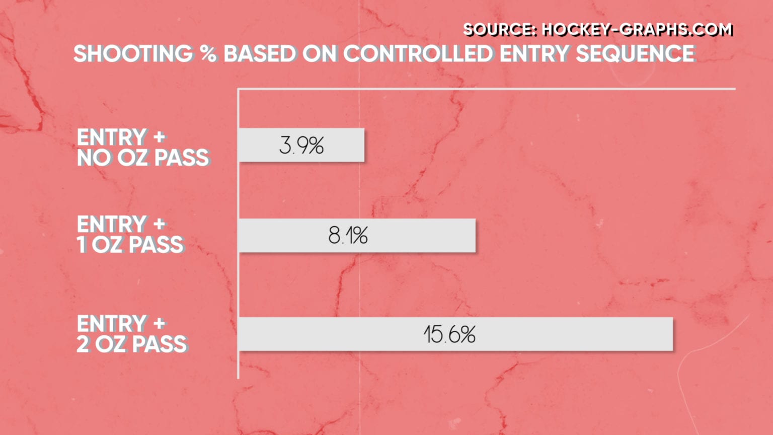 In 2016, The Coaches Site contributor Ryan Stimson expanded on Tulsky and others’ research, studying the impact of completed passes after a controlled zone entry. He found that with more completed passes following a controlled entry, the higher the shooting percentage of the shot attempt.
