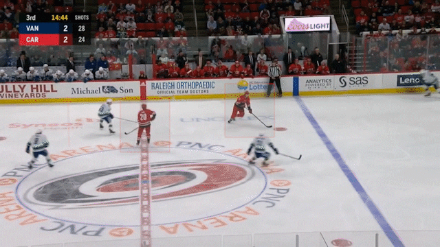 Once again, the Canes stretch the play into the neutral zone, bypassing Vancouver’s forecheck with a swift bounce pass. The key element here is that Sebastian Aho, #20 in red, is cutting through centre ice and onto the strong side. This forces Quinn Hughes (#43 in white) to fall back and draws his partner, Chris Tanev (#8), to shift over into the middle of the ice. Aho’s cut creates ample ice on the weak side for the Canes to utilize. Their man delaying in the neutral zone with the puck hits Svechnikov with speed through the blue lines, dashing in on a flat-footed Hughes.