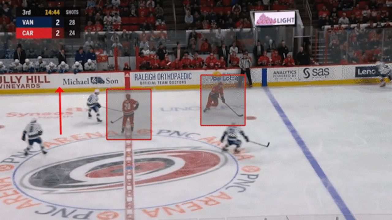 Once again, the Canes stretch the play into the neutral zone, bypassing Vancouver’s forecheck with a swift bounce pass. The key element here is that Sebastian Aho, #20 in red, is cutting through centre ice and onto the strong side. This forces Quinn Hughes (#43 in white) to fall back and draws his partner, Chris Tanev (#8), to shift over into the middle of the ice. Aho’s cut creates ample ice on the weak side for the Canes to utilize. Their man delaying in the neutral zone with the puck hits Svechnikov with speed through the blue lines, dashing in on a flat-footed Hughes.