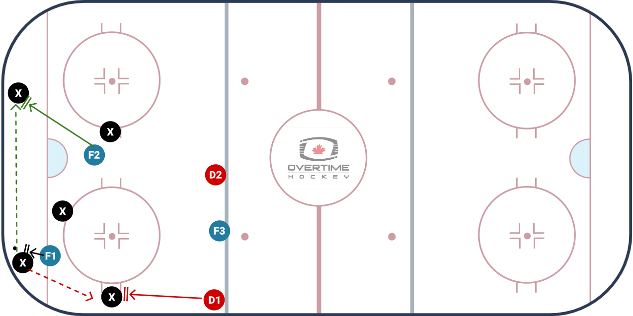 Weaknesses: F1 has to make sure they take the right angle to the puck forcing the defenceman to the weakside, if the opponent makes a good read and reverses they can break this puck out fairly easy on the strong side