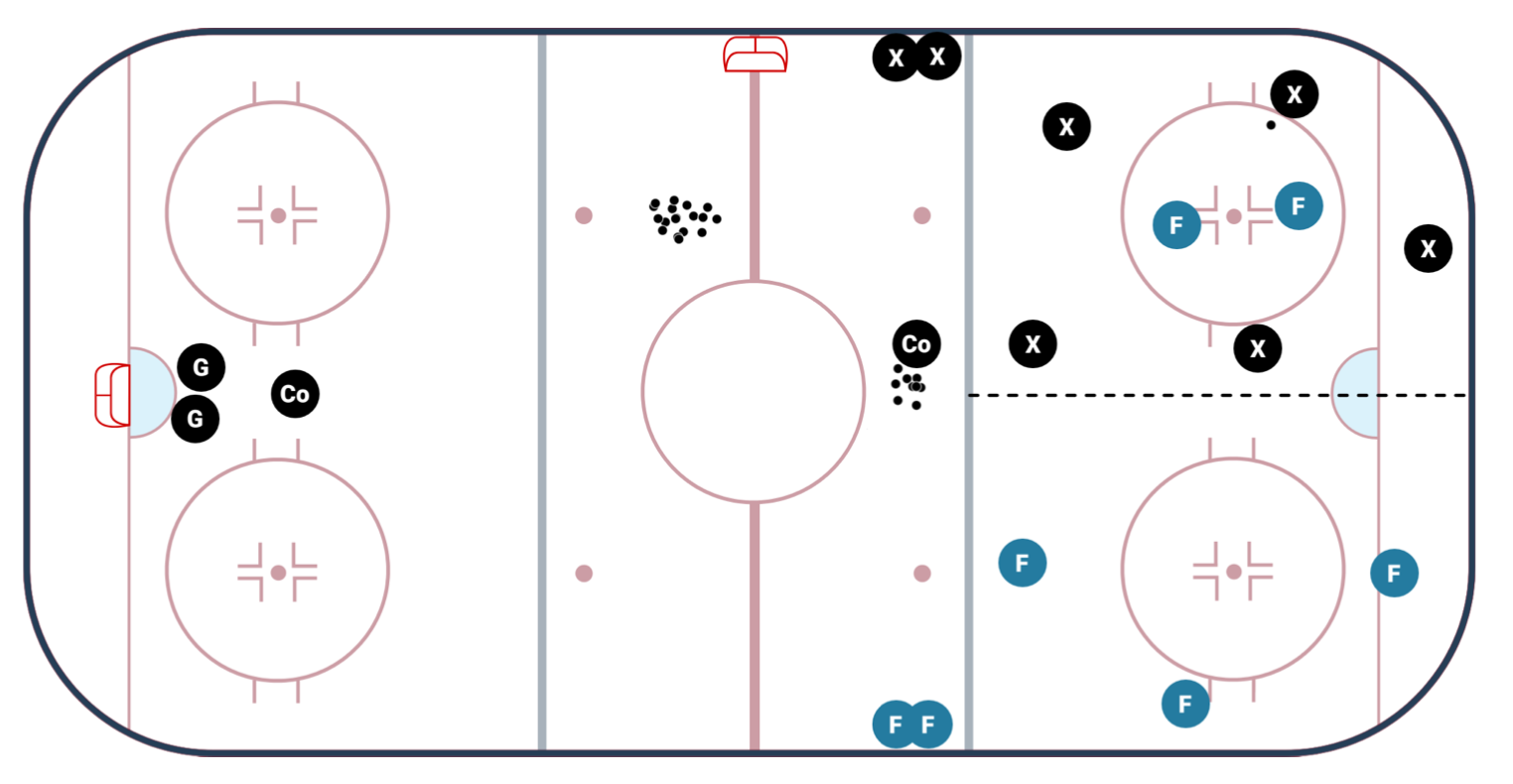 - Coach spots puck to one team (Team A) who is now on offense, Team B must send 2 players over to Team A's side to try to get the puck.