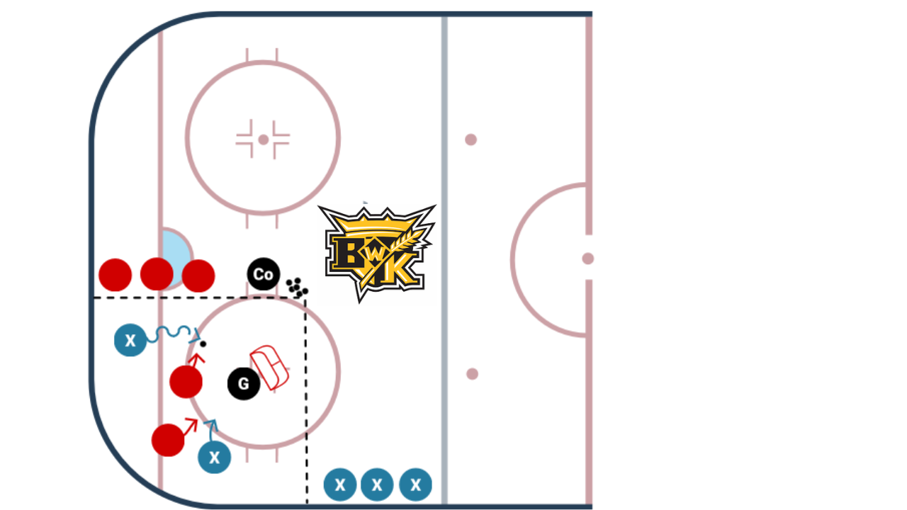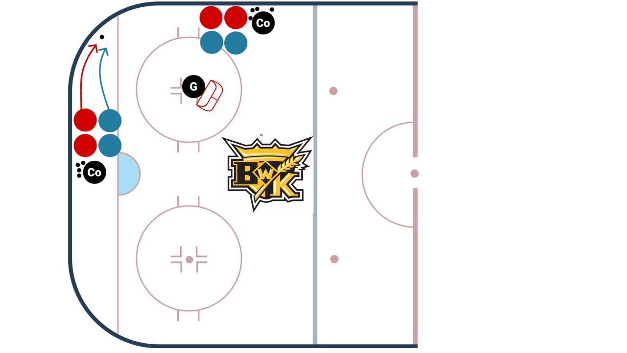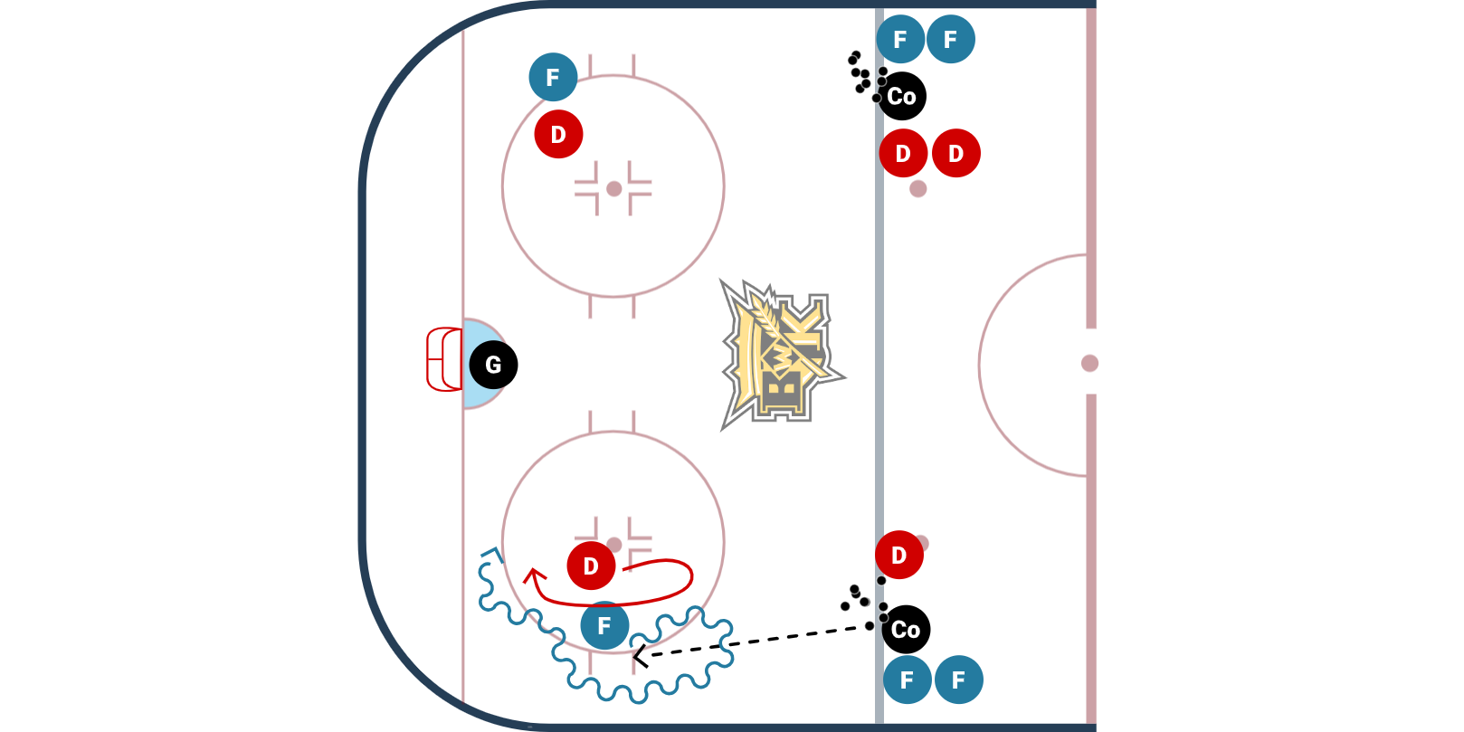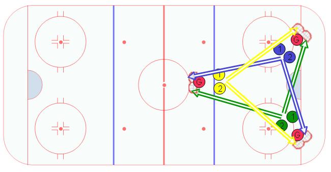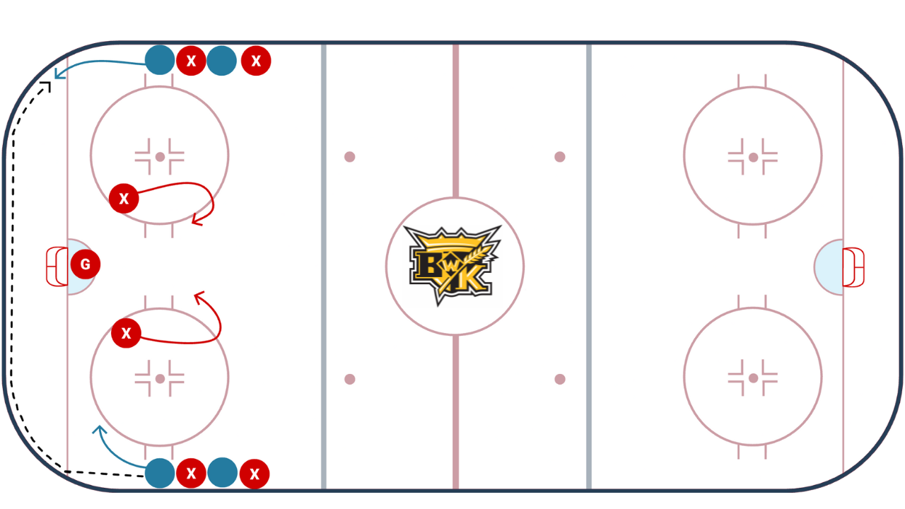 - Coach designates which side starts as 1 v 1. When coach says offensive player retrieves puck from corner (simulating lose puck in corner).