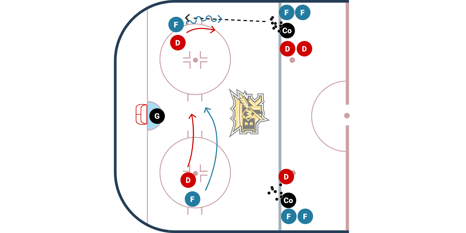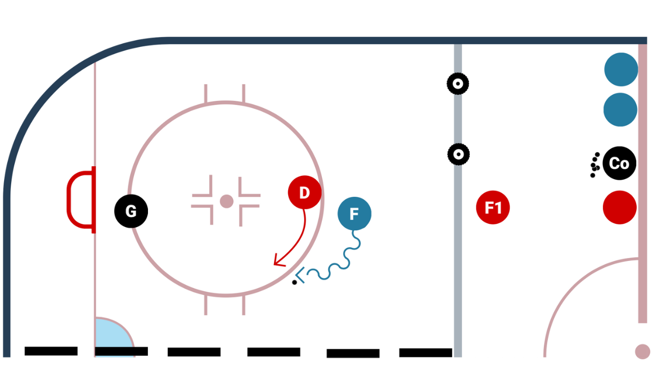 - The defender tries to defend and can end the game by skating the puck out of the zone through the gates passing the puck to the next forward in line (shown as F1 in this diagram).