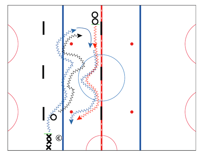 On the whistle first player (O) leaves with a puck and zig zags in the zone in any pattern they want. Using their crossovers to move from side to side.