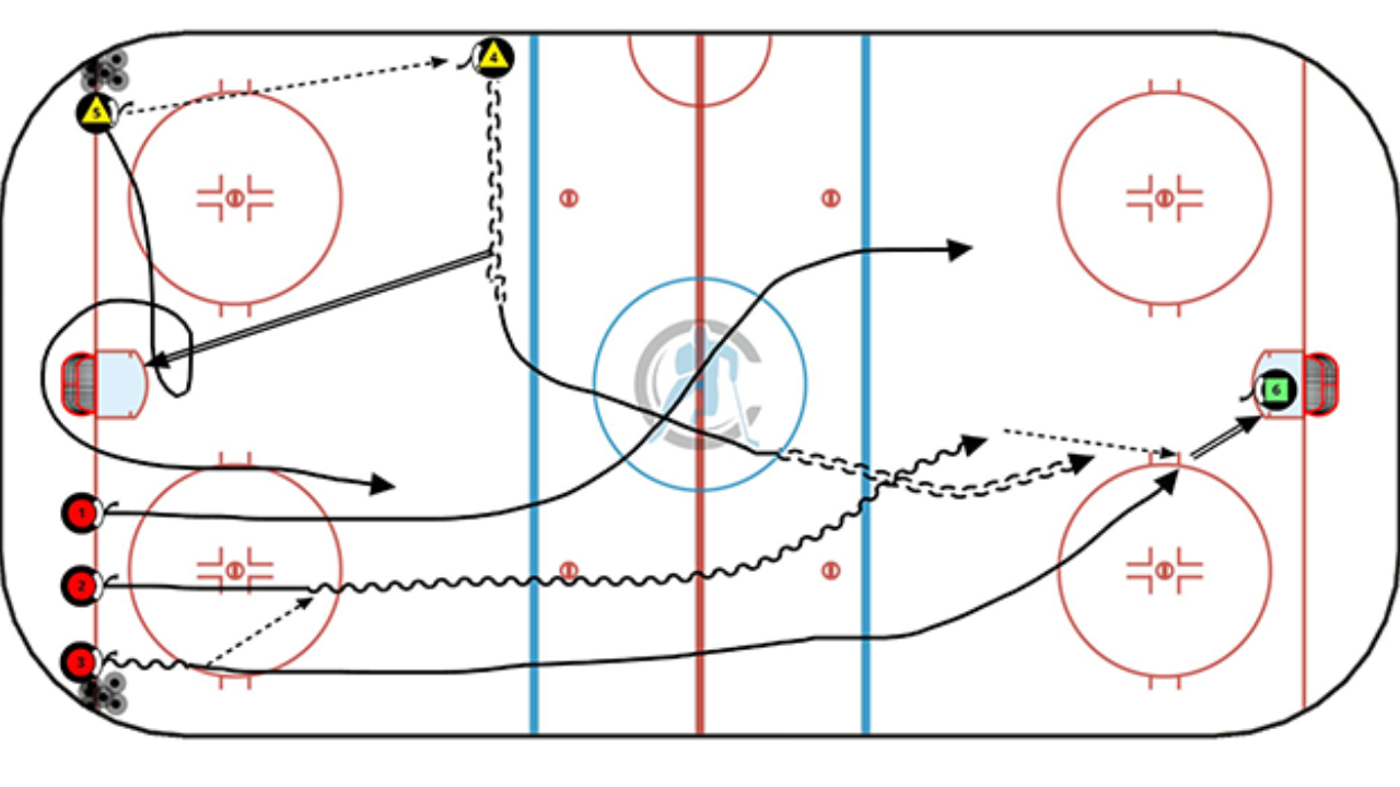 These forwards are moving into the zone with speed, and like the drill above, spreading out and giving themselves options. This time however, they know they have a defensive player coming in behind them, so they must know their options quickly when getting into the zone.