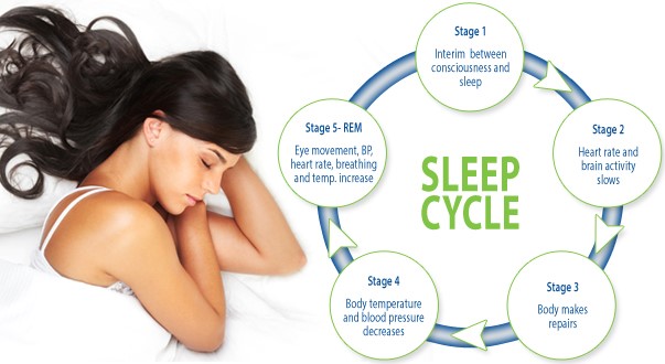 In stage one, the body starts to lose muscle tone, the muscles twitch, and there is a loss of self-awareness. Stage two is a light dreamless sleep with a loss of nearly all muscle tone, and brain activity, heart rate, and breathing slow down. Stage three is the beginning of deep sleep and human growth hormone starts to be released. Stage four is the deepest sleep, and is important because it replenishes physical and mental energy. The body does most of its repair work in stages three and four because of the release of human growth hormone. Stage five is also called “Rapid Eye Movement,” or REM sleep, because the eyes dart back and forth in this stage. Dreaming is done in REM sleep. Dreaming is important for healthy brain functioning, providing energy to the brain and body, and the creation of long-term memories.