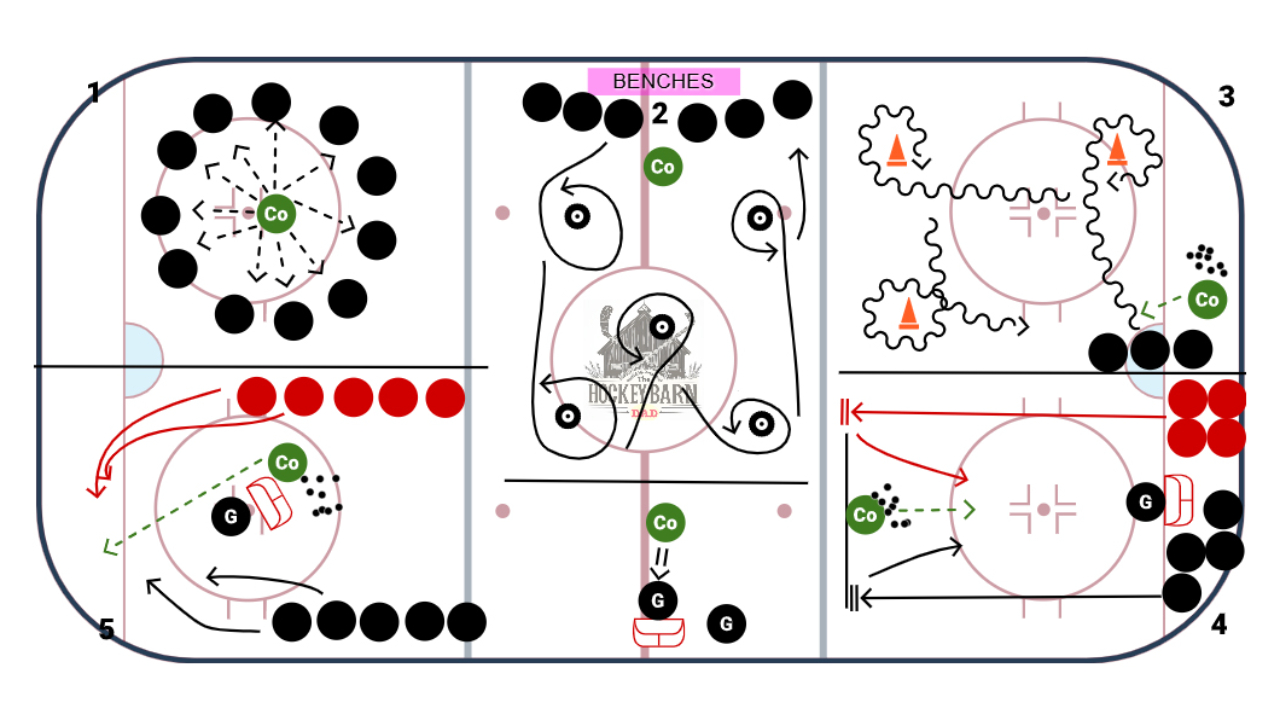 3) Stick Handling:  Skaters take the puck out and work their pucks around the cones, working on keeping movement, as well as puck control the entire time.