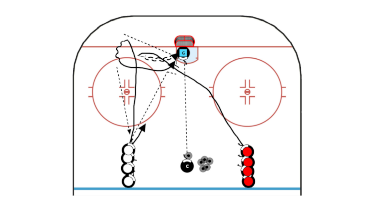 1v1 activates 2v2. Coach shoots puck in and goalie plays puck to the corner. One player from each line battle for the puck. The player winning possession passes to a teammate then goes to the net front. The teammate shoots and then joins the play. When the other team gains possession they must first carry the puck below the goal line before passing back to the teammate. Players can pass back to a third teammate who shoots but cannot join the play.