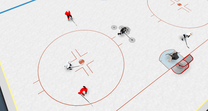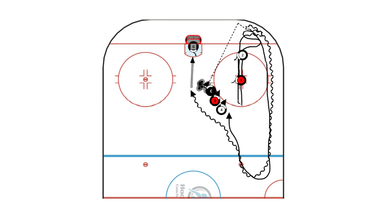 P1 starts with one skate on the face-off dot. P2 starts with one skate on the goal line. On the whistle, P1 sprints to the dot, stops and sprints back to the corner for the loose puck as P2 sprints to the edge of the circle, stops, then sprints into the corner to check P1. The goal is to skate it to the blue line. The winner brings it back for a scoring chance.