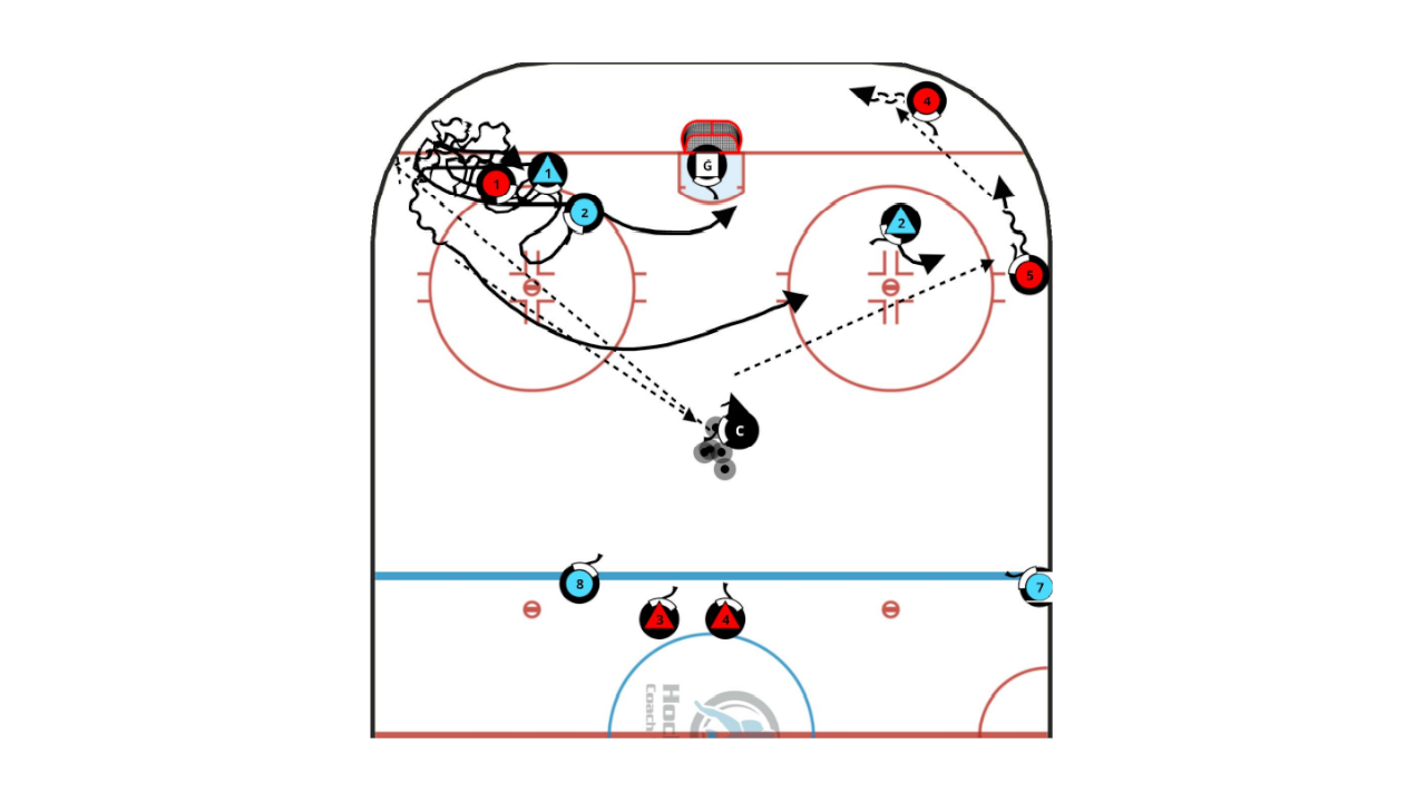Coach dumps a puck into the corner to start 1vs2 play. Once defenders recover the puck, they pass it to the coach who moves it to the other side to start 2vs3 play as both defenders must hustle over to create 2vs3. Defenders recover the puck, move it to the Coach who changes sides again for 3vs5 play as defensive wingers move into position and defenders hustle back to the other side.