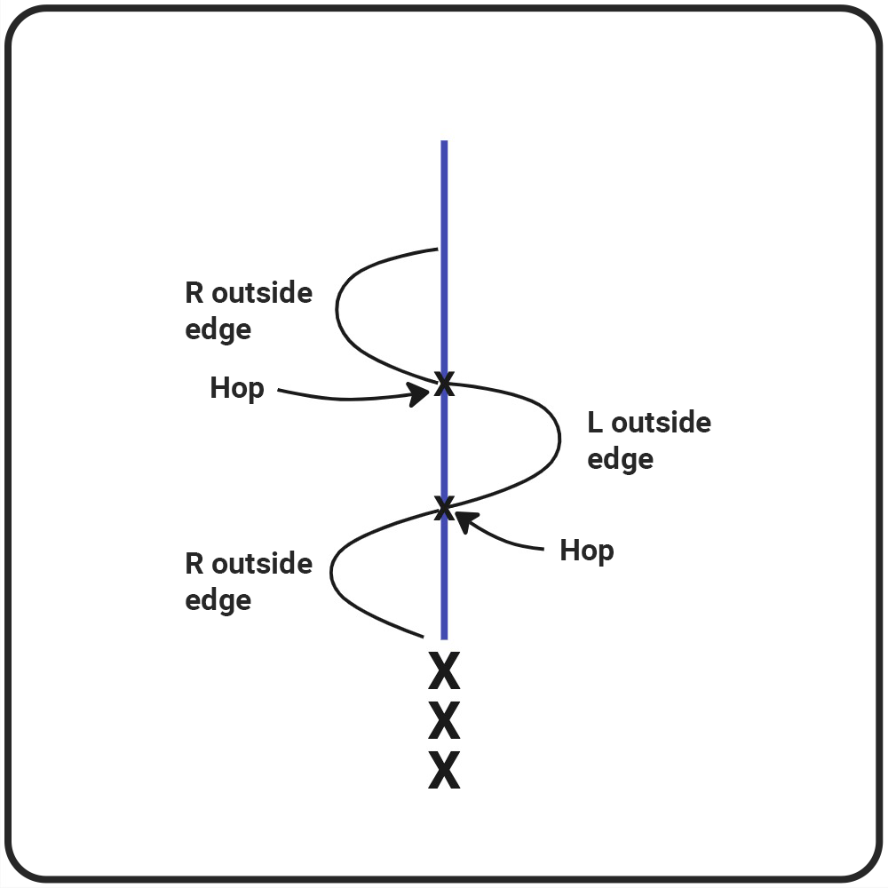 - Players perform alternating outside edges down the blue line with a one foot hop on the change of foot.