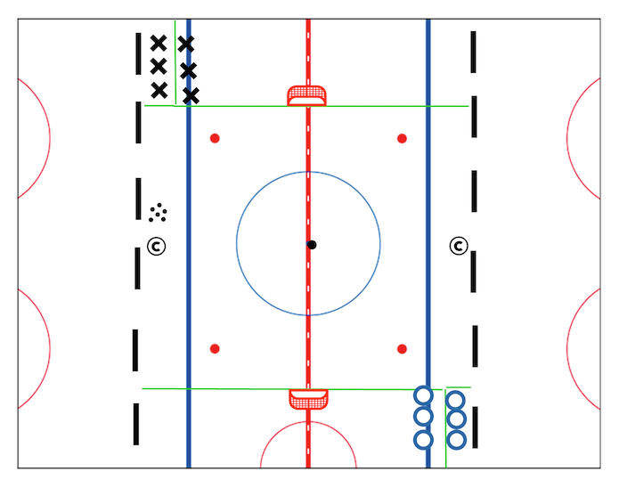 3vs3 Blast Off is a great game to get players sprinting up the ice. Encourage players to attack the net with speed and go for rebounds.