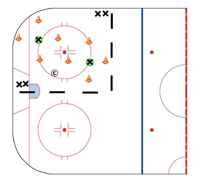 Coach draws a circle and then spreads 4 cones out about 10-15 feet apart. and repeats for a second group. Coach also indicates names for each cone per grouping (1,2,3,4 or North, East, South, West)