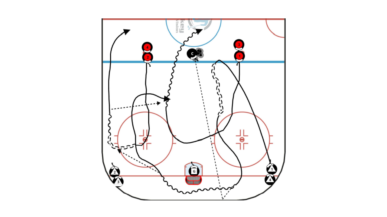 D1 steps up over the blue line, pivots backwards and retrieves the puck, skating hard behind the net. F1 and F2 must read D1 and move into a break out position once D1 commits to wheeling with the puck, or cutting back behind the net.