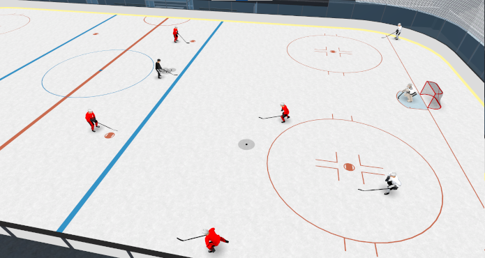 - Goalie plays the shooter as D1 pushes shooter wide and takes away the cross pass to the other forward.