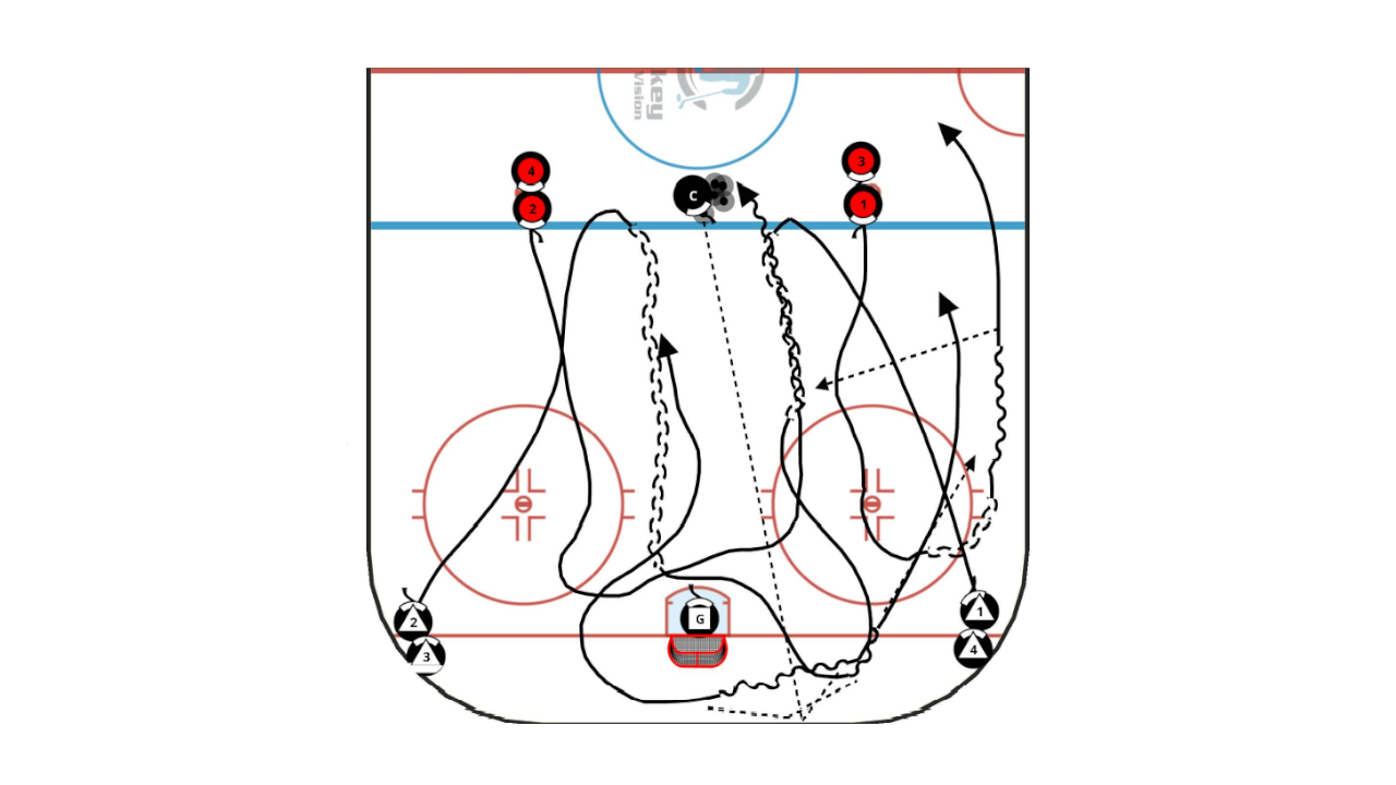 • F in the middle of the ice on the break out, cut across in front of the net “low and slow” to be positioned slightly behind the F taking the pass on the wall.