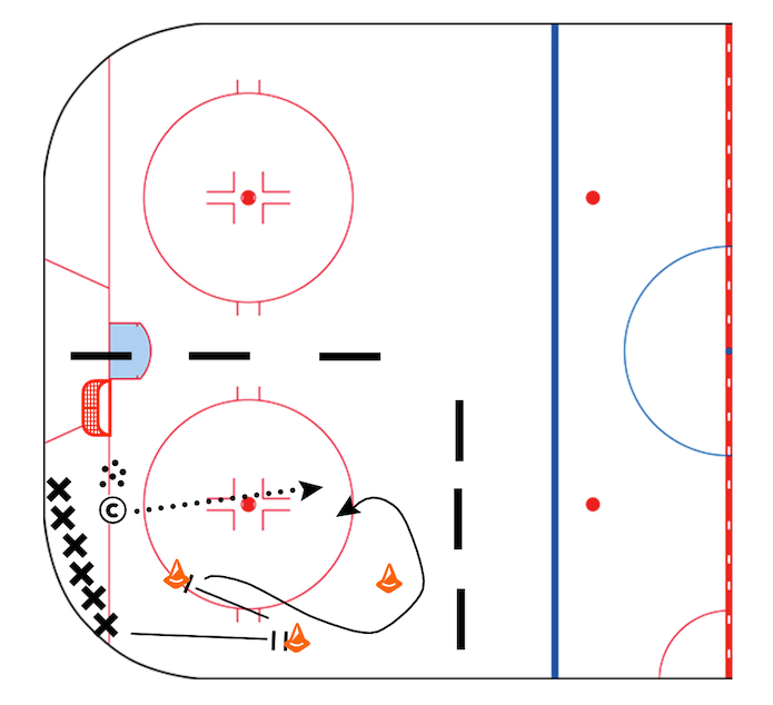 Once the player has stopped in both directions they skate around the far cone and then turns towards the net.