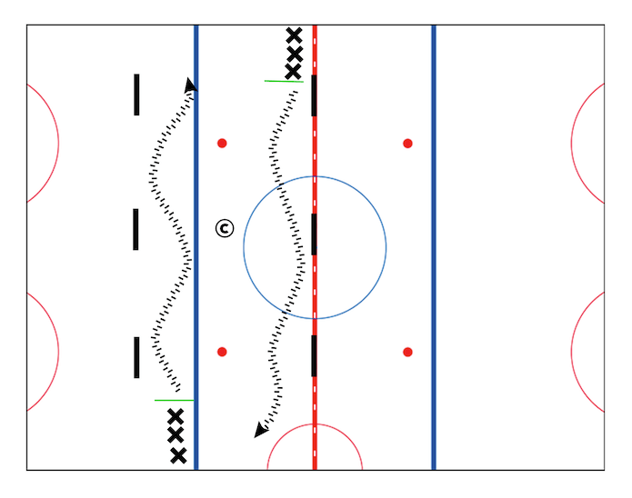 On the whistle first players skate to the far side while performing different crossover patterns at the coaches direction.
